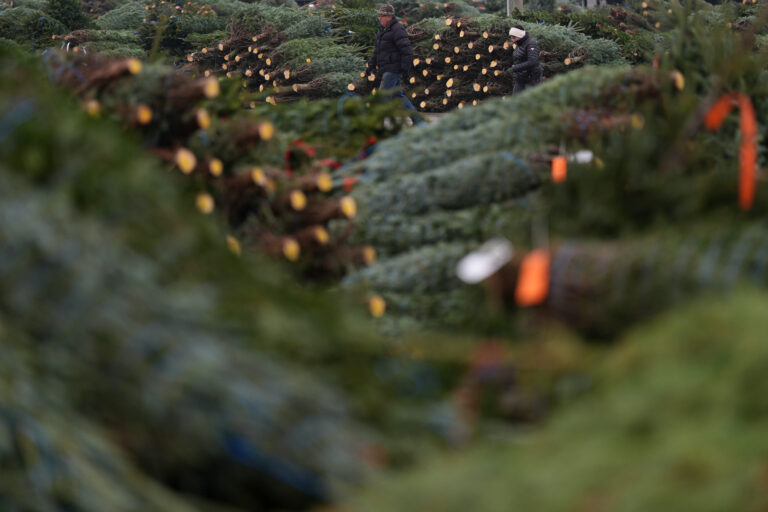 Ľudia prechádzajú pomedzi hromady vianočných stromčekov na aukcii produktov v Buffalo Valley v Mifflinburgu. Pensylvánia, 20. novembra 2025. Foto: AP Photo/Matt Slocum