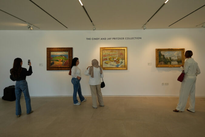 Návštevníci si prezerajú zbierku umeleckých obrazov počas predaukčnej výstavy v Abú Zabí v Spojených arabských emirátoch. Tieto obrazy od Vincenta van Gogha, Paula Gauguina, Fridy Kahlo, Edvarda Muncha, Reného Magritta a Camilla Pissara sa majú v novembri 2025 na aukcii v New Yorku predať za 1,5 milióna amerických dolárov. Spojené arabské emiráty, 1. októbra 2025 Foto: AP Photo/Altaf Qadri