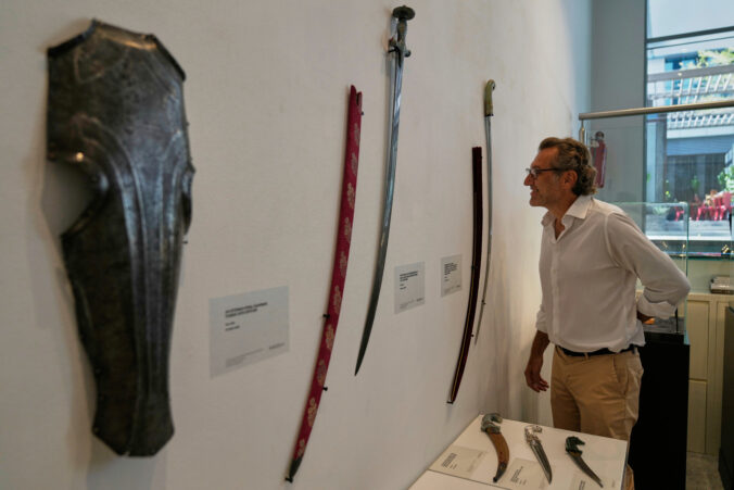 Návštevník si prezerá zbrane zo zbierky islamských a indických zbraní a brnení Philippa Missillier vystavené v galérii Sotheby's Dubai