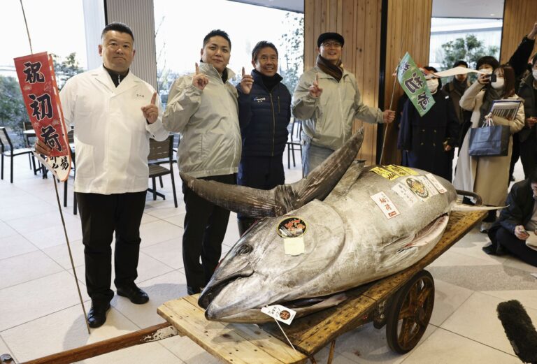 Potenciálni kupujúci si prezerajú tuniaky počas prvej aukcie roka na trhu Toyosu v Tokiu. Japonsko, 5. januára 2025. Foto: Kyodo News via AP