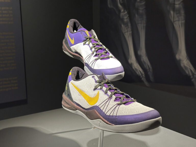 Dvojica tenisiek Nike Kobe 8, ktoré mal na sebe zosnulý Kobe Bryant počas svojho „Achillovho zápasu“ v roku 2013, sa draží v aukčnom dome Sotheby's v New Yorku, kde sa očakáva, že sa predajú za 600 000 až 800 000 dolárov. USA, 3. februára 2025. Foto: AP Photo/Ted Shaffrey