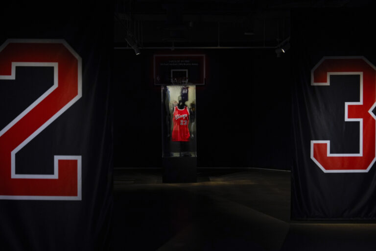 Prvý dres Chicago Bulls, ktorý Michael Jordan nosil počas zápasu, bol vystavený v aukčnej sieni Sotheby's v New Yorku, kde sa má vydražiť. USA, 21. marca 2025 Foto: AP Photo/Julia Demaree Nikhinson