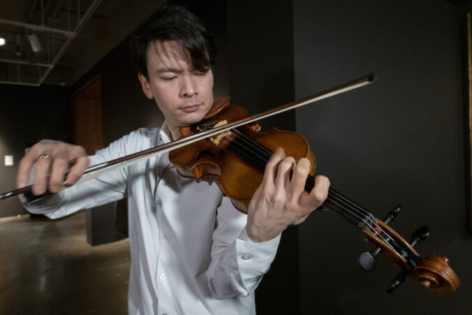 Huslista Stefan Jackiw hrá na gitare Joachima-Ma Stradivariho z roku 1714 v aukčnom dome Sotheby's v New Yorku. USA, 3. februára 2025. Foto: AP Photo/Ted Shaffrey