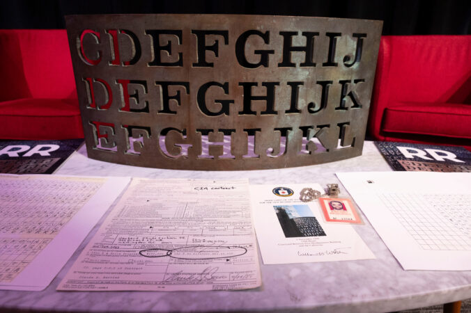 Predmety zo stavby sochy Kryptos vystavené na stole počas tlačovej konferencie v Medzinárodnom múzeu špionáže vo Washingtone. Spojené štáty americké, 12. novembra 2025. Foto: AP Photo/Kevin Wolf