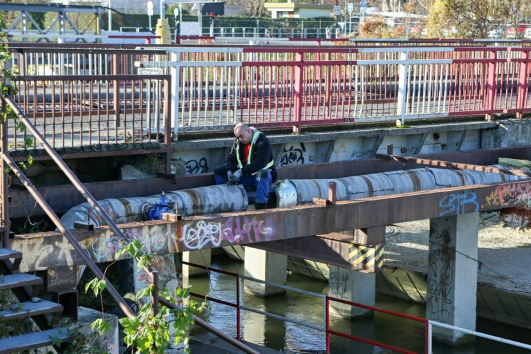 Robotník počas rekonštrukcie uzavretého mosta na Hradskej ulici vo Vrakuni. Bratislava. 30. november 2024. Foto: SITA/Tomáš Susko