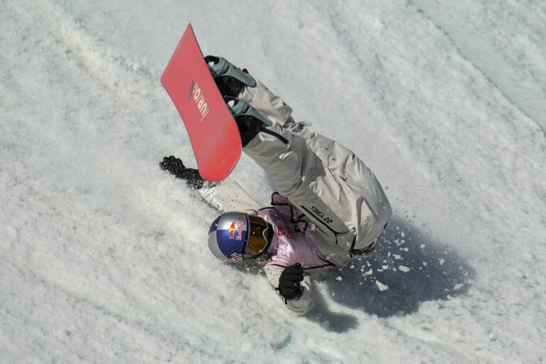 Mari Fukada z Japonska padá počas súťaže snowboardistiek Big Air v rámci Svetového pohára v Číne, Peking, 30. november 2024. Foto: SITA/AP