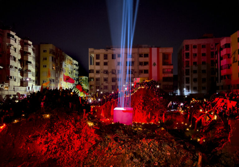 Ľudia sa zhromažďujú na mieste, kde bol koncom septembra zabitý bývalý vodca Hizballáhu Sayyed Hassan Nasrallah izraelskými náletmi počas spomienkovej slávnosti v južnom predmestí hlavného mesta Libanonu. Bejrút, 30. november 2024. Foto: SITA/AP