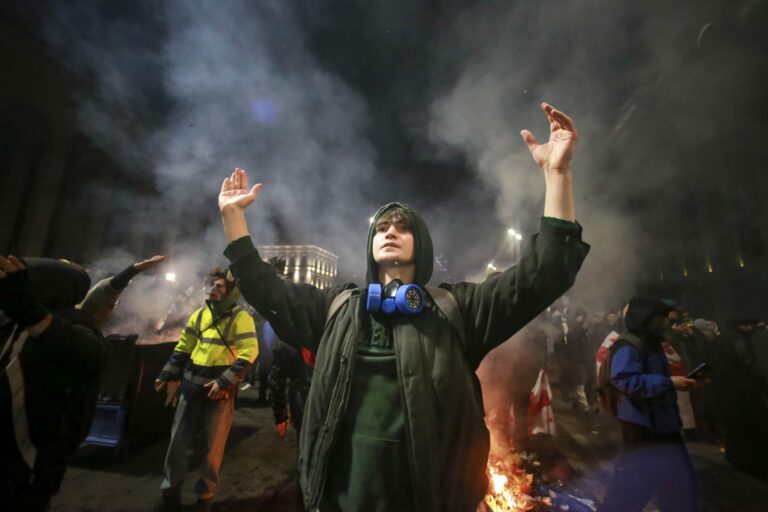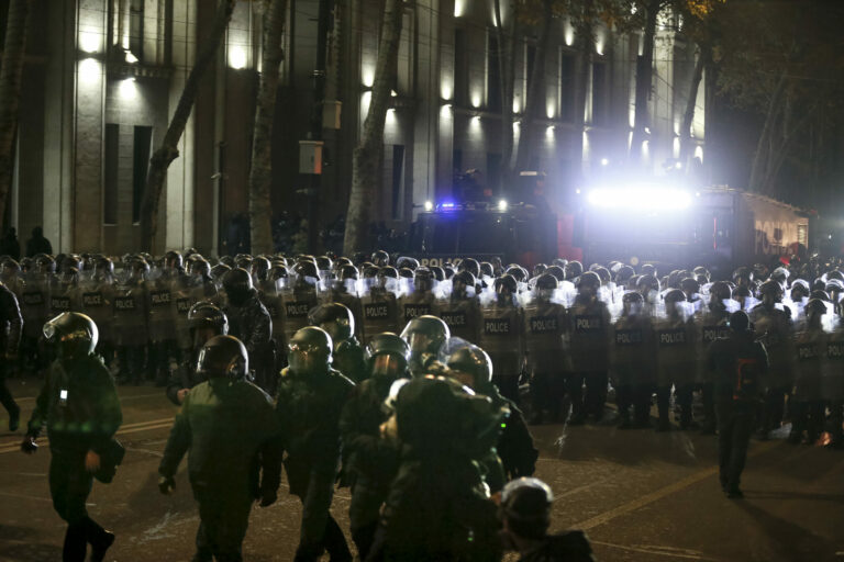 Polícia sa chystá zatlačiť demonštrantov počas protestu Gruzíncov proti rozhodnutiu vlády o pozastavení rokovaní o vstupe krajiny do Európskej únie. Tbilisi, 30. november 2024. Foto: SITA/AP