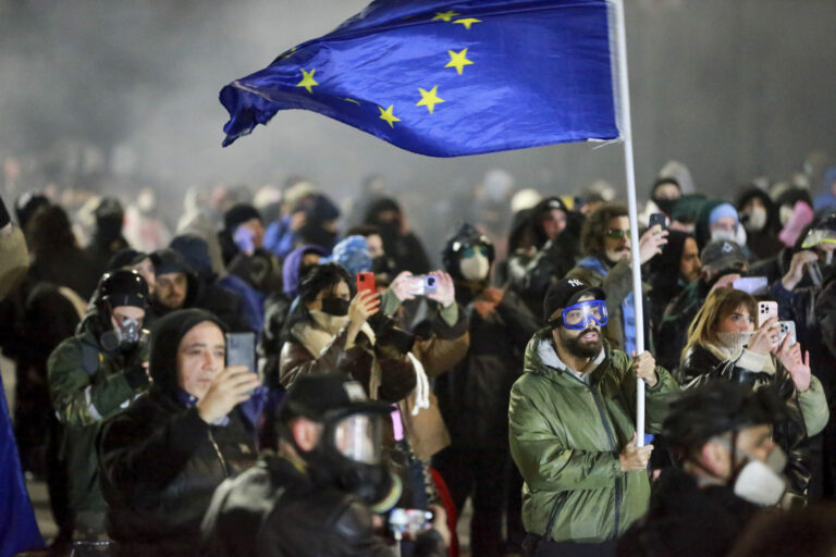 Demonštranti stoja proti policajtom počas protestu Gruzíncov proti rozhodnutiu vlády o pozastavení rokovaní o vstupe krajiny do Európskej únie. Tbilisi, 30. november 2024. Foto: SITA/AP