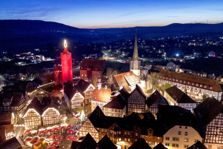 42 metrov vysoká sviečka, ktorá je v skutočnosti osvetlenou stredovekou vežou v historickom centre nemeckého mesta Schlitz. 30. november 2024. Foto: SITA/AP