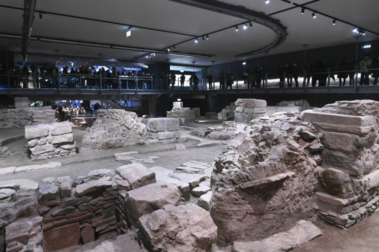 Počas dňa otvorenia solúnskeho metra v severnom Grécku v sobotu 30. novembra 2024 postávajú cestujúci okolo archeologického náleziska, ktoré sa nachádza vo vnútri stanice metra Venizelou. Solún, 30. november 2024. Foto: SITA/AP