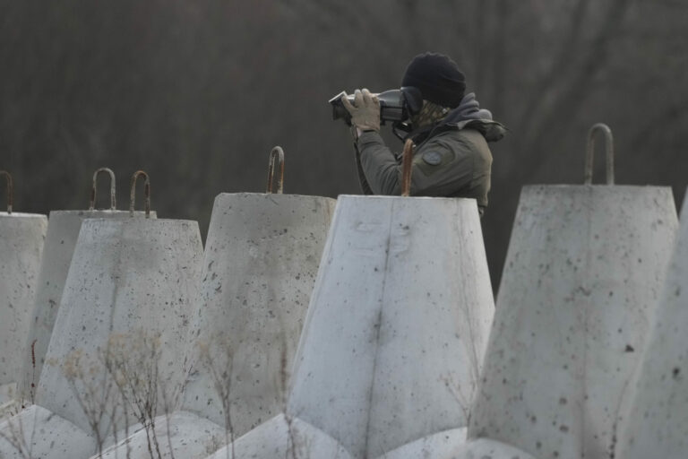 Poľský vojak sleduje oblasť na hraniciach Poľska s Ruskom, kde boli umiestnené betónové protitankové zátarasy. Dabrowka, 30. november 2024. Foto: SITA/AP