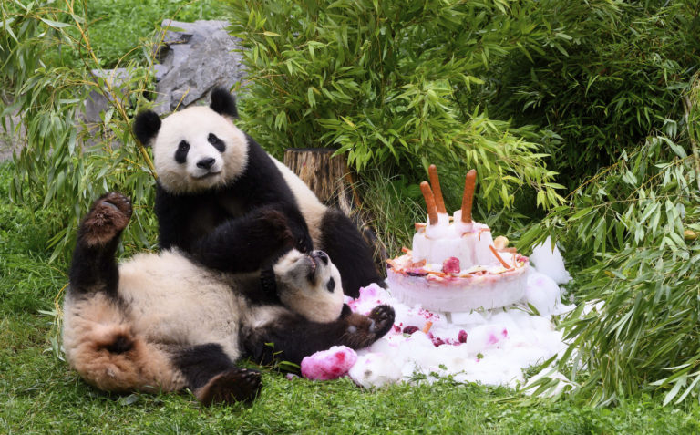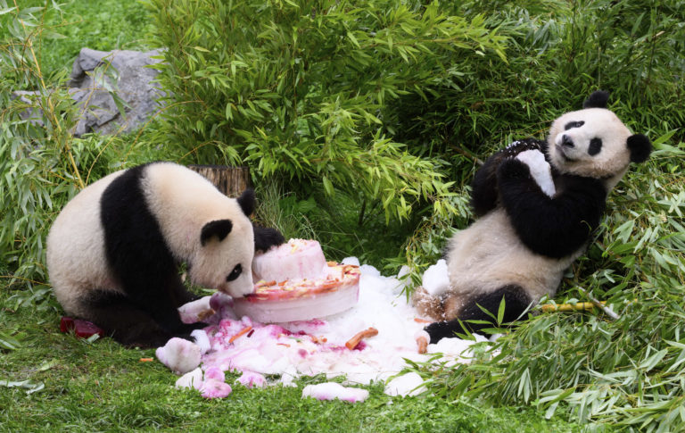 Pandy, dvojičky, Pit a Paule jedia tortu, zmrzlinu, zeleninu a ovocia v deň svojich štvrtých narodenín v zoologickej záhrade v Berlíne. Foto: Bernd von Jutrczenka/dpa via AP.