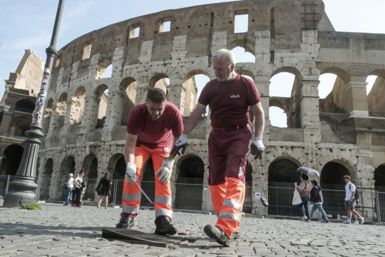 Čistenie kanálov a ukladanie otravy pre potkany pri Koloseu v Ríme. Foto: Mauro Scrobogna/LaPresse via AP.