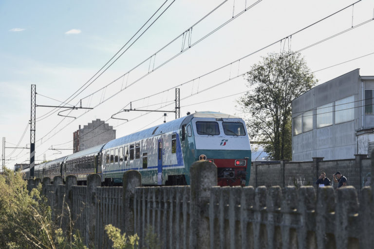 Policajti v Brandizze, blízko Turína, kde vlak zrazil a usmrtil päť železničných pracovníkov, ktorý v nočných hodinách vykonávali údržbu. Foto: Alberto Gandolfo/LaPresse via AP.