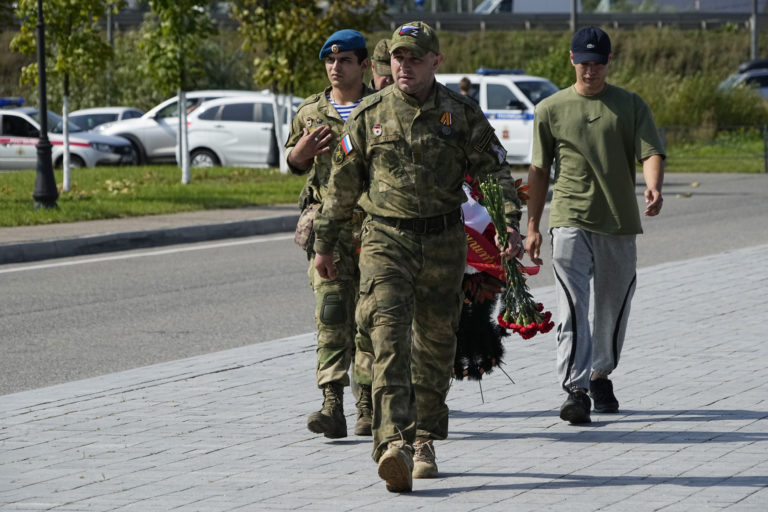 Vojaci kráčajú na poslednú rozlúčku s Dmitrijom Utkinom na cintoríne v Mytiščiach. Utkin riadil vojenské operácie žoldnierskej Wagnerovej skupiny a zahynul pri páde lietadla spoločne s Jevgenijom Prigožinom Foto: SITA/AP.
