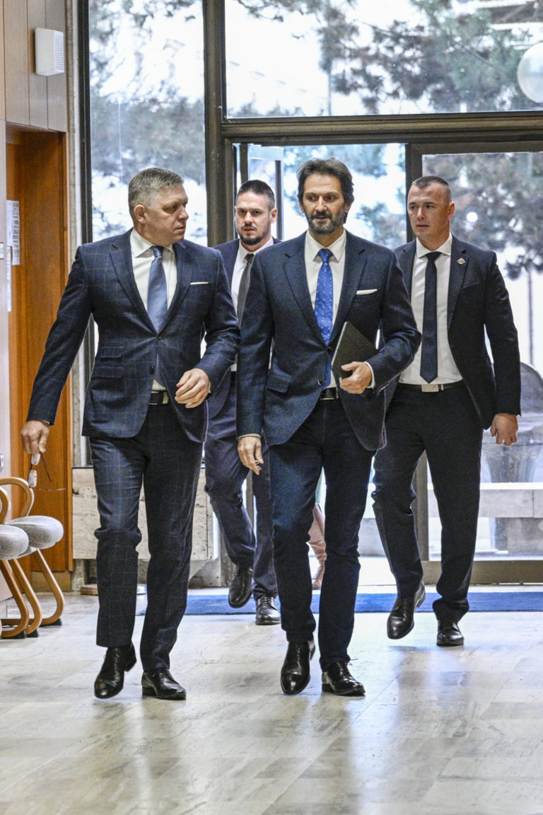 Zľava v popredí: Predseda vlády SR Robert Fico a minister obrany Róbert Kaliňák počas príchodu na rokovanie 7. schôdze vlády SR. Foto: SITA/Milan Illík.