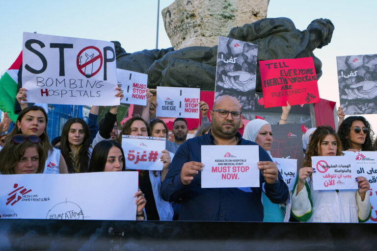Členovia medzinárodnej humanitárnej skupiny Lekári bez hraníc držia plagáty počas protestu volajúceho po ukončení vojny v Pásme Gazy. Foto: SITA/AP.