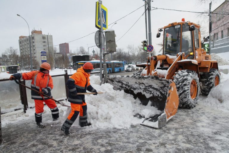 Odstraňovanie snehu z ciest a chodníkov v Moskve po silnom snežení. Foto: Vasilij Kuzmičenok/Moscow News Agency via AP.