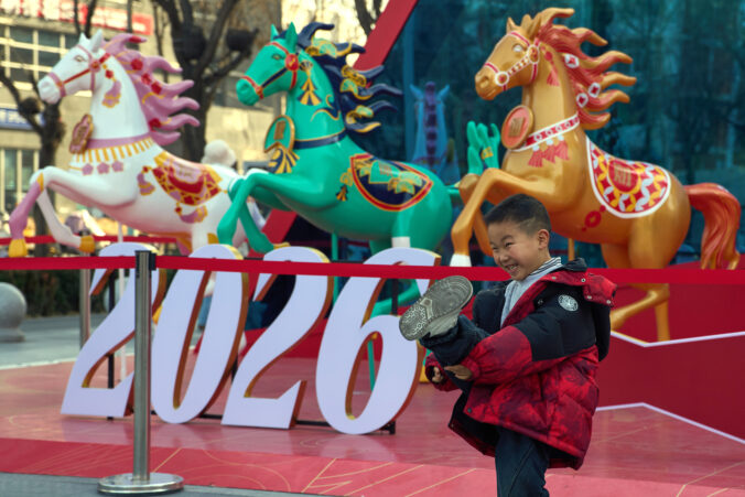 Dieťa pózuje pri výzdobe pripravenej pred čínskym lunárnym Novým rokom koňa v Pekingu. Čína, 4. februára 2026. Foto: AP Photo/Ng Han Guan