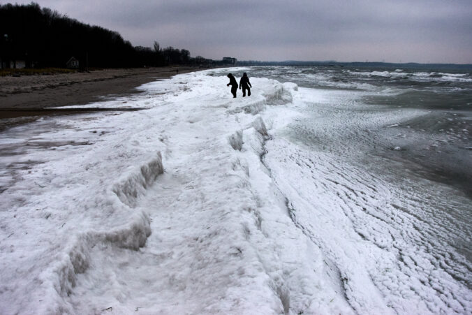 Ľudia kráčajú po ľadom pokrytej pláži Baltského mora v nemeckom Scharbeutzi počas chladnej a veternej stredy. Nemecko, 4. februára 2026. Foto: AP Photo/Michael Probst
