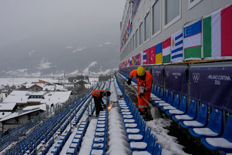 Pracovníci odstraňujú sneh zo sedadiel v lyžiarskom centre Stelvio pred Zimnými olympijskými hrami 2026 v talianskom Bormiu. Taliansko, 4. februára 2026. Foto: AP Photo/John Locher