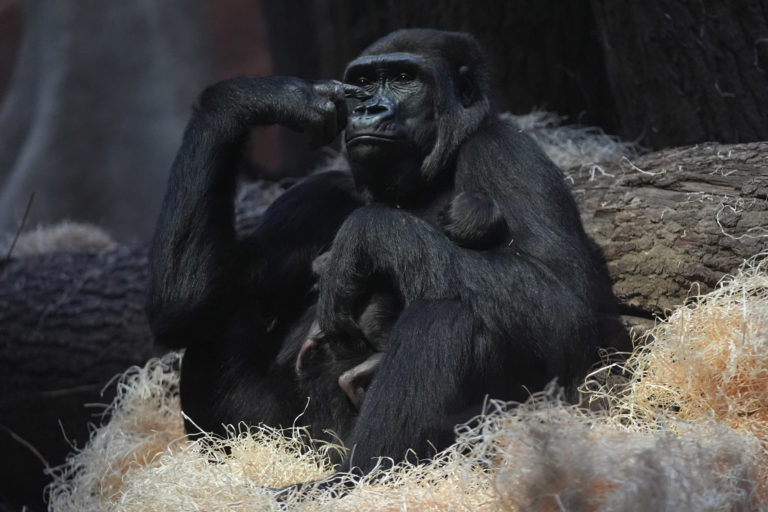 10-ročná gorila Duni zo ZOO v Prahe drží svoje novonarodené mláďa. Duni porodila 2. januára 2024 a mláďa ešte nemá meno. Foto: SITA/AP Photo/Petr David Josek