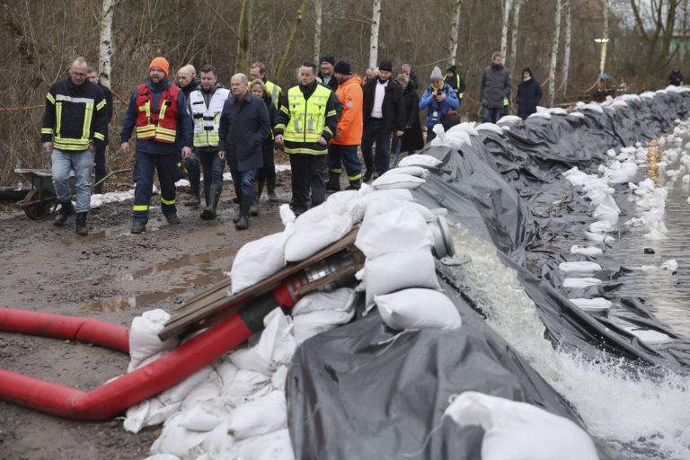 Nemecký kancelár Olaf Scholz a okresný správca Mansfeld-Südharz André Schröder kráčajú po hrádzi postavenej z vriec piesku. Nemecko v týchto dňoch trápia záplavy. Foto: SITA/Jan Woitas/dpa via AP
