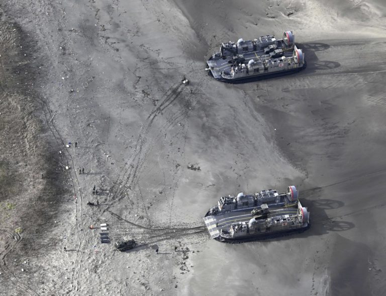 Letecká snímka zachýva vykladanie ťažkej techniky z pristávacích plavidiel japonských síl sebaobrany. Technika pôjde pomáhať do mesta Wajima, ktoré v uplynulých dňoch zasiahlo silné zemetrasenie. Foto: SITA/Kyodo News via AP