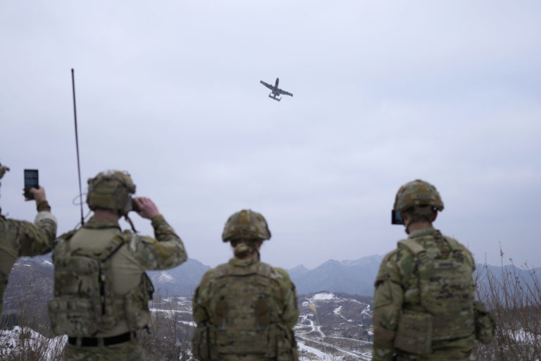 Vojaci pozorujú lietadlo A-10 Thunderbolt, ktoré patrí americkému letectvu. Ide o spoločné vojenské cvičenie medzi Južnou Kóreou a Spojenými štátmi. Foto: SITA/AP Photo/Lee Jin-man