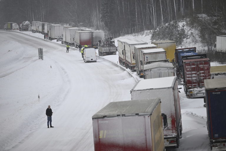 Veľké množstvo kamiónov uviazlo na E22 pri Linderöde v južnom Švédsku. Dôvodom je veľké množstvo snehu, ktoré napadlo na vozovku. Foto: SITA/Johan Nilsson/TT News Agency via AP