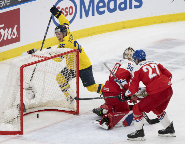 Otto Stenberg zo Švédska (vľavo) sa raduje z gólu v bránke Česka počas semifinálového zápasu na MS v hokeji do 20 rokov. Göteborg, 4. január 2024. Foto: Christinne Muschi/The Canadian Press via AP