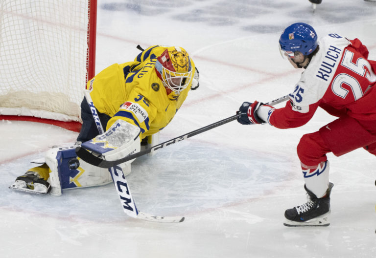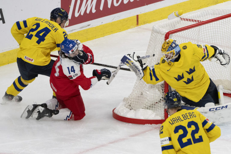 Brankár Švédska Hugo Havelid (vľavo) zneškodňuje gólovú príležitosť Jiřího Kulicha z Česka počas semifinálového zápasu na MS v hokeji do 20 rokov. Göteborg, 4. január 2024. Foto: Christinne Muschi/The Canadian Press via AP