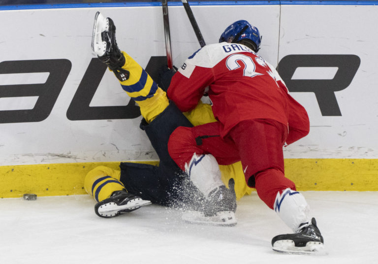 Tom Willander zo Švédska (vľavo) fauluje Adama Židlického z Česka počas semifinálového zápasu na MS v hokeji do 20 rokov. Göteborg, 4. január 2024. Foto: Christinne Muschi/The Canadian Press via AP