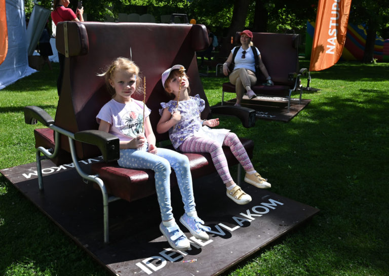 Návštevníčky sedia na lavičkách zo starých vozňov v oddychovej zóne počas prvého ročníka rodinného Festivalu cestovania a zážitkov KROKY 2024 organizovaného Železničnou spoločnosťou Slovensko (ZSSK) v Kulturparku v Košiciach. Košice, 4. máj 2024. Foto: SITA/Viktor Zamborský