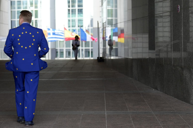 Muž má na sebe oblek vo farbách EÚ pred Európskym parlamentom počas osláv Dňa Európy v Bruseli. Foto: SITA/AP