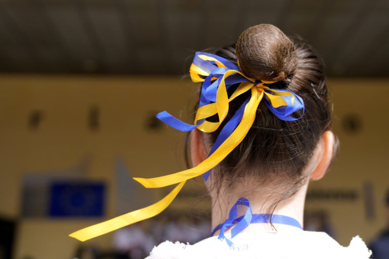 Žena má vo vlasoch stuhu vo farbách Ukrajiny a čaká na vystúpenie pred Európskou komisiou v rámci osláv Dňa Európy v Bruseli. Foto: SITA/AP