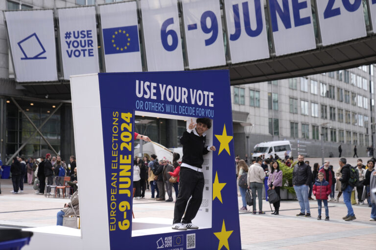 Muž pózuje v ráme pred Európskym parlamentom počas osláv Dňa Európy v Bruseli. Foto: SITA/AP
