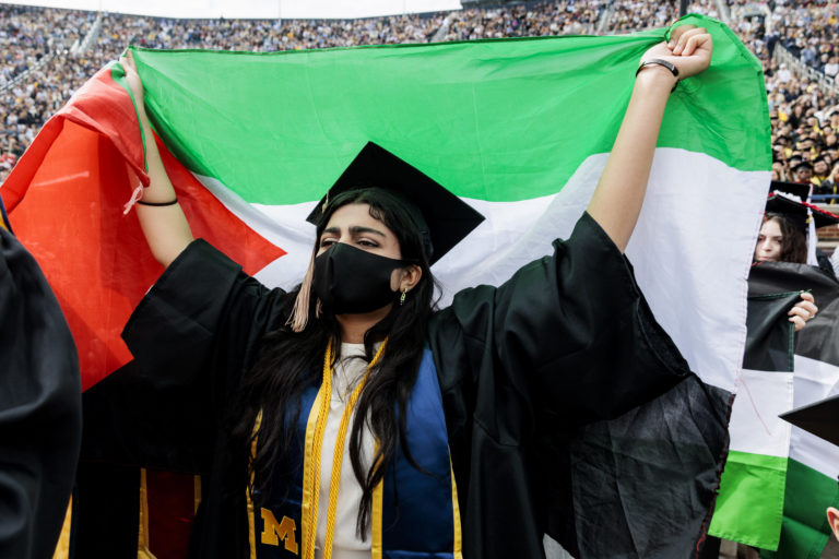 Propalestínski demonštranti počas jarného slávnostného ceremoniálu Michiganskej univerzity 2024. Foto: Jacob Hamilton/Ann Arbor News via AP