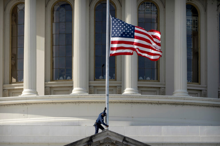 Pracovník spúšťa americkú vlajku na pol žrde v Kapitole vo Washingtone na znak úcty k zosnulému bývalému americkému viceprezidentovi Dickovi Cheneymu. Spojené štáty americké, 4. novembra 2025 Foto: (AP Photo/Mark Schiefelbein)