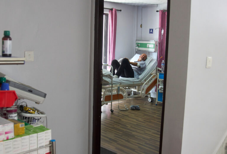 Preživší lavíny na hore Yalung Ri, Didier Armand odpočíva po tom, ako ho zachránili a letecky previezli do nemocnice v nepálskom Káthmandu. Nepál, 4. novembra 2025. Foto: (AP Photo/Niranjan Shrestha)