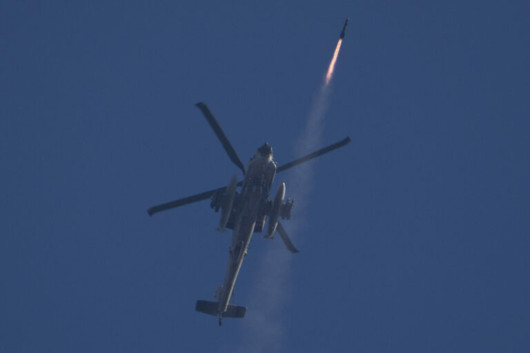 Helikoptéra Apache izraelskej armády strieľa raketu na cieľ v južnom Libanone. 14. október 2024. Foto: SITA/AP