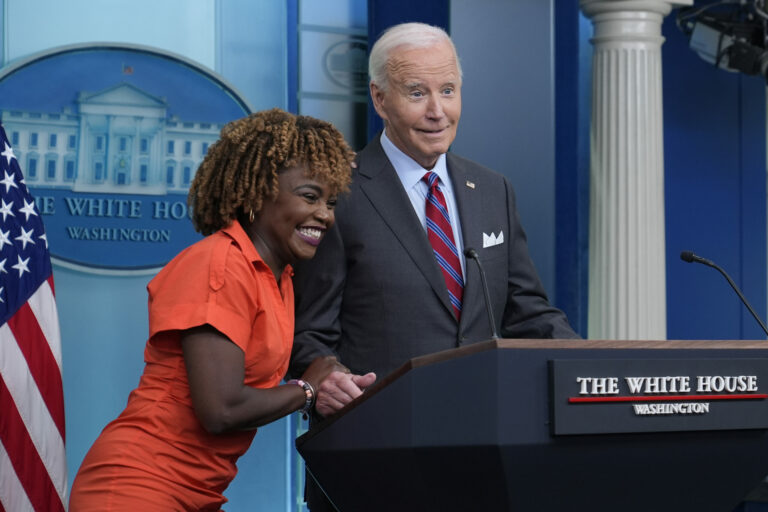 Joe Biden a tlačová tajomníčka Bieleho domu Karine Jean-Pierre počas pravidelného brífingu, na ktorom sa nečakane objavil aj prezident USA. Washington, 4. október 2024. Foto: SITA/AP