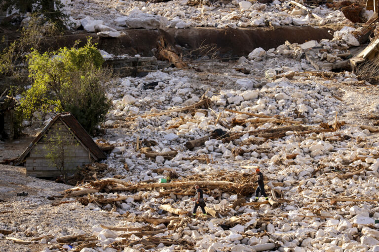 Členovia horskej záchrannej služby a civilnej obrany vykonávajú pátracie a záchranné operácie v oblasti zničenej zosuvom pôdy v Bosne. Donja Jablanica, 4. október 2024. Foto: SITA/AP