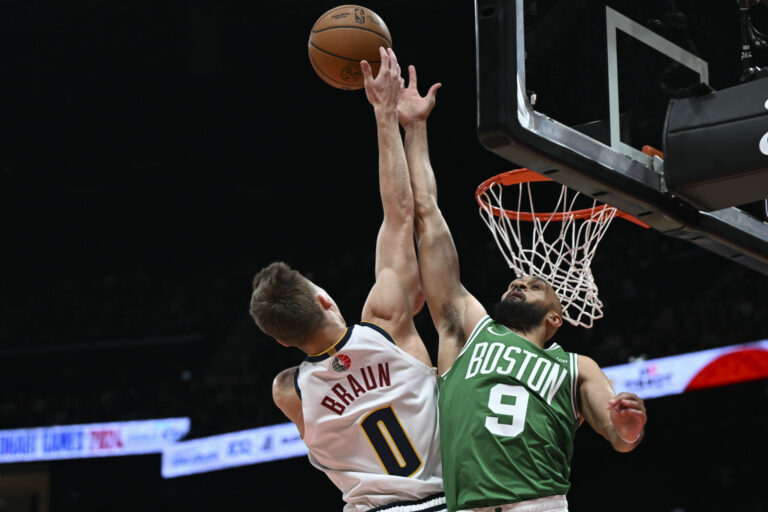 Derrick White z tímu Boston Celtics (vpravo) blokuje strelu Christiana Brauna z Denveru Nuggets v prípravnom zápase pred sezónou NBA. Abú Zabí, 4. október 2024. Foto: SITA/AP