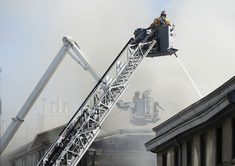 Kanadskí hasiči bojujú s požiarom v Starom Montreale. Montreal, 4. október 2024. Foto: Ryan Remiorz /The Canadian Press via AP