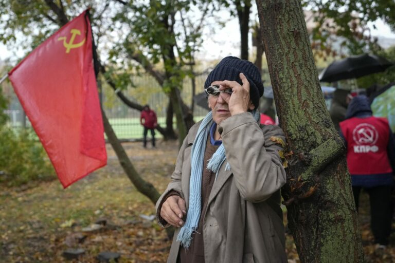 Účastník zhromaždenia konaného pri príležitosti 31. výročia krvavých stretov z roku 1993 medzi vládnymi silami a prívržencami povstaleckého parlamentu v Rusku. Moskva, 4. október 2024. Foto: SITA/AP