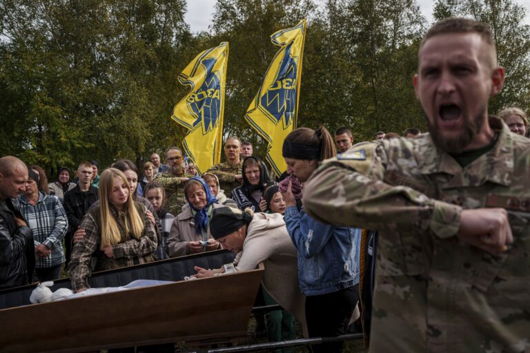 Pohreb Ihora Kusočka, ukrajinského vojaka z brigády Azov, ktorý bol zabitý na frontovej línii v Torecku. Travkine, 4. október 2024. Foto: SITA/AP