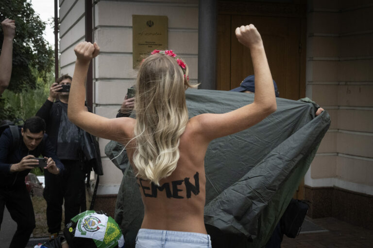 Policajt sa snaží zakryť polonahú členku ukrajinského feministického hnutia Femen počas jej protestu pred ambasádou Iránu proti rusko-iránskej vojenskej spolupráci. Kyjev, 4. október 2024. Foto: SITA/AP