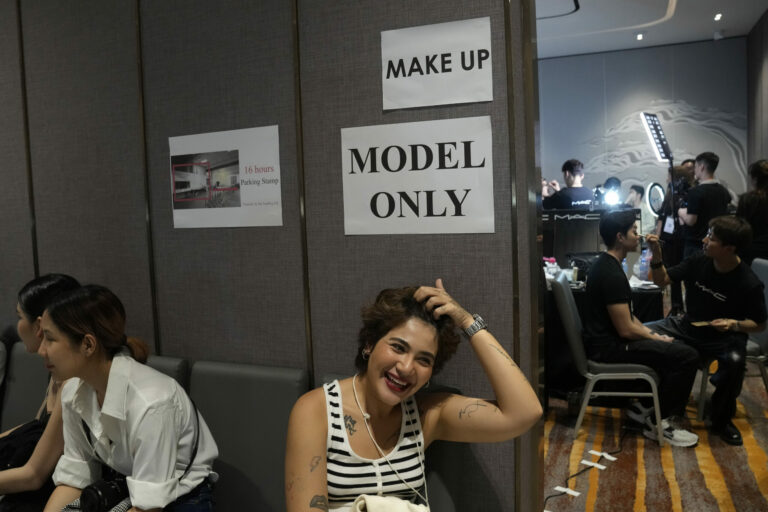 Vizážistka robí posledné úpravy modelke v zákulisí prehliadky Poem počas medzinárodného týždňa módy v Thajsku. Bangkok, 4. október 2024. Foto: SITA/AP
